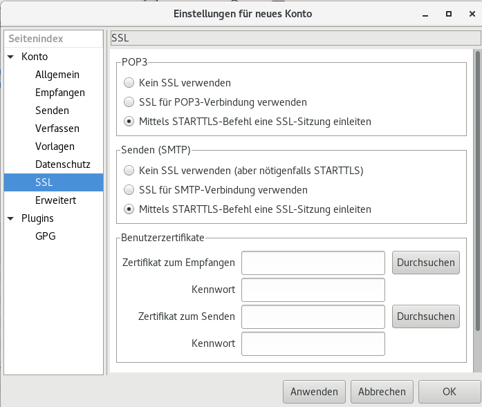 3. SSL – Wähle STARTTLS für POP3 und SMTP.