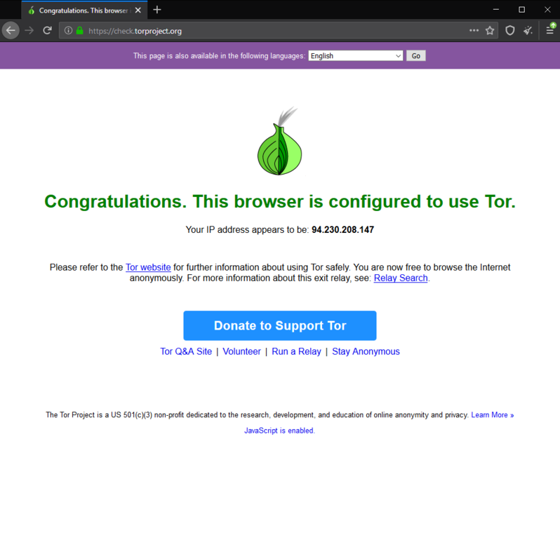 Once Tor is ready, Tor Browser will open a menu with buttons “Connect” and “Configure”. Unless you live in an oppressive state that censors internet or if you would like to use a proxy to connect to the Tor network, this can be ignored. Once “Connect” is clicked, Tor will establish a connection and will automatically open a Firefox like web browser. Only web pages visited through Tor Browser will be sent via Tor. Other web browsers such as Google Chrome and Firefox are not affected by Tor. Before browsing, it is a good idea to ensure you are connected to the Tor network. To reduce the risk of confusion, don’t run the normal Firefox web browser while using the Tor Browser, as its better to close existing Firefox windows before starting.